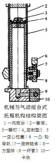 氣動瓶托機械以壓縮空氣為動力,具有良好的減震和緩沖能力,發生故障時不易摔破瓶,但活塞的速度受氣壓變化的影響很大。。如果壓降大,則不僅瓶的上升速度變慢,而且難以保持瓶口與灌裝頭之間的緊密接觸。如果壓力上升幅度較大,則瓶子上升速度會加快,從而難以與進水管對齊,從而使瓶子受到強烈沖擊。機械和氣動組合的瓶子固定機構,旋轉穩定可靠。壓縮空氣在環形管中循環。它只需要增加泄漏損耗。它被廣泛使用,但凸輪導軌也會增加潤滑,磨損和行駛阻力。
