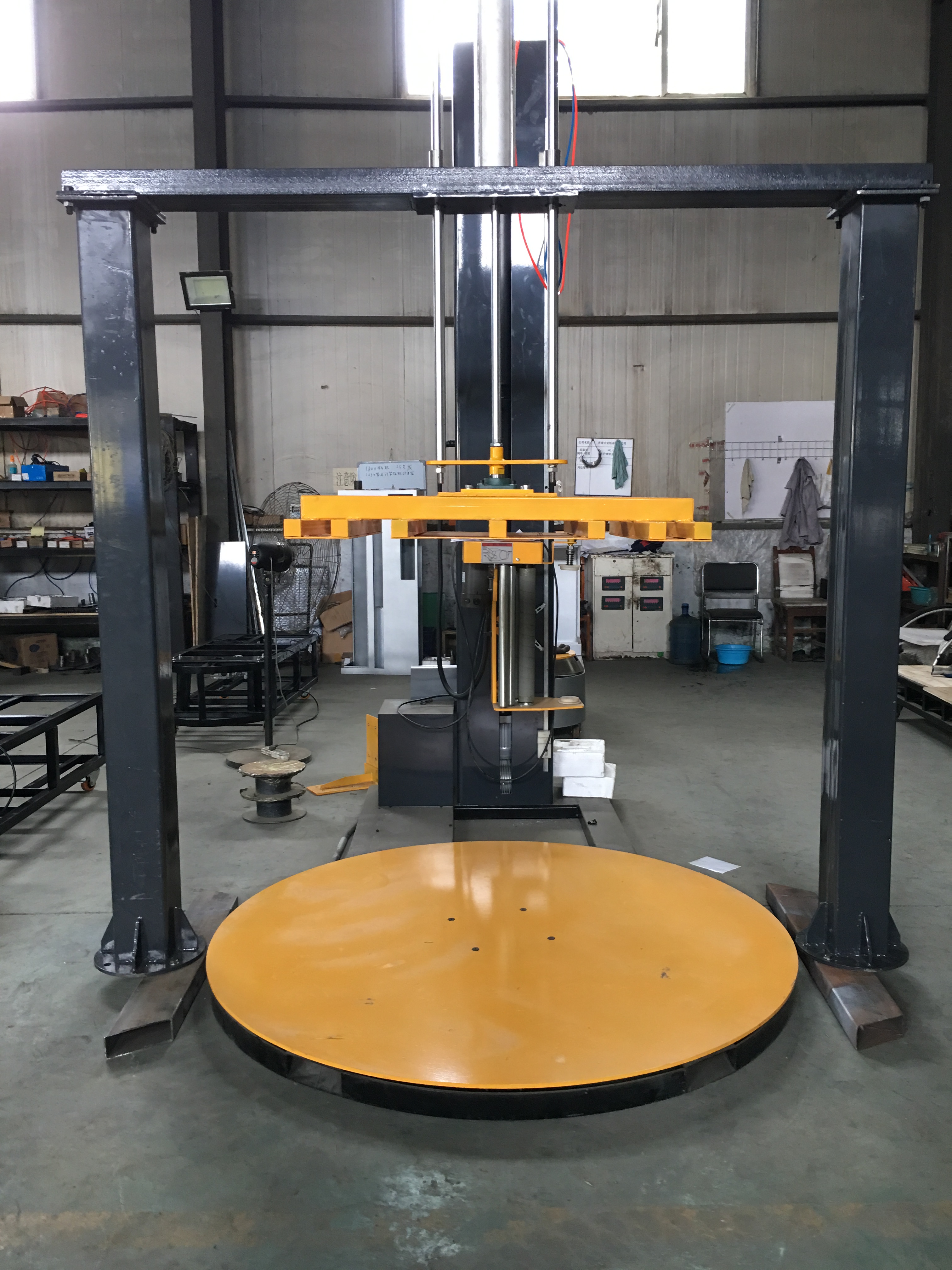 1、貨物比較散。所謂的貨物比較散,最典型的就是一個托盤上面落很多產品,在轉盤轉動或者纏繞的過程中貨物容易散落,這種情況下就需要選擇壓頂纏繞