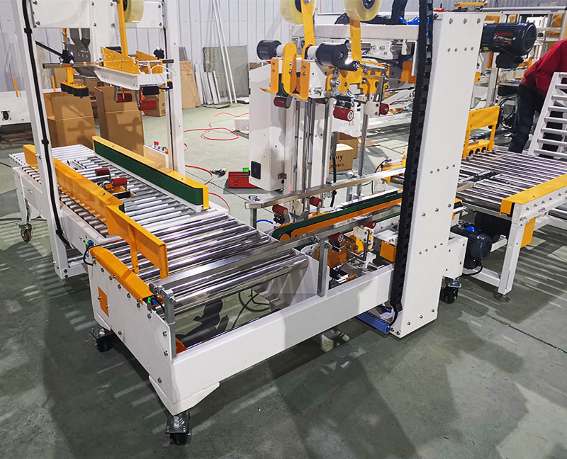 ? ? ??自動四角邊封箱機工型封箱機的成功研發,使封箱機在面對特別行業需進行角邊封箱,特別是針對與電子產業和需走海運的行業,防塵、防潮、防氧化、防酸堿度;更具紙箱規格,手工調節寬度及高度,方便、快速;90°轉角機,氣缸自動推箱;紙箱上下四個角邊同時自動封箱、撫平、快速、平穩;可與多款機型聯機組合完成工字型封箱機。